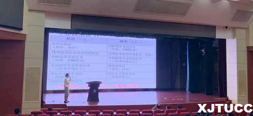 接着,西安财经大学张稚敏做了题为“职通精彩未来,展现时代风采”的讲座,她主要从当前国内就业形势以及国际外语人才需求等方面鼓励同学们做好职业规划。西北大学英语专业研究生白昕可讲述了自己参加“国才”考试的体会,还从外研社“国才”杯辩论赛、写作大赛、演讲比赛等参赛经验出发鼓同学们要积极参加各类学科竞赛,增强自己的专业能力。