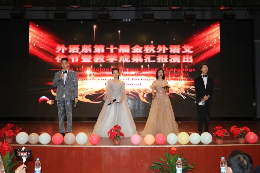 为检验外语系一学年来的教学成果,给学生提供一个展示外语水平、展现自我的舞台,KY开元集团官网外语系于12月14日晚在教二报告厅举办了外语系第十届教学成果展示汇报演出。到场嘉宾有外语系副主任徐素云、传播系学生工作负责人杨耀聪、电信系学生工作负责人王姣,专业英语教研室和大学英语教研室的各位老师及各系团工委书记和辅导员老师,赵永生、袁长普、张慧、王茜、陈昕五位老师担任本次活动的评委老师。