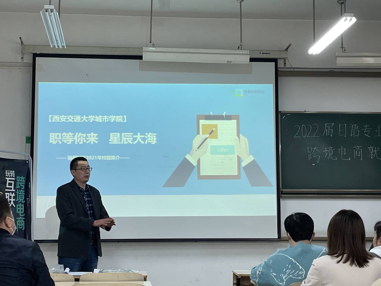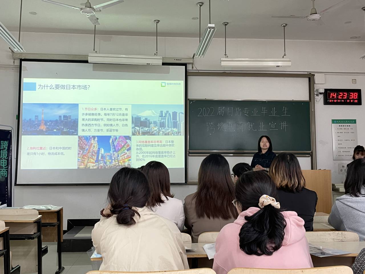 10月14日下午,KY开元集团官网外语系在D509举办了2022届日语专业毕业生跨境电商就业宣讲会。陕西骊都时尚科技有限公司HRBP王鑫鑫女士以及外语系主任助理吴夫迎出席了本次活动。