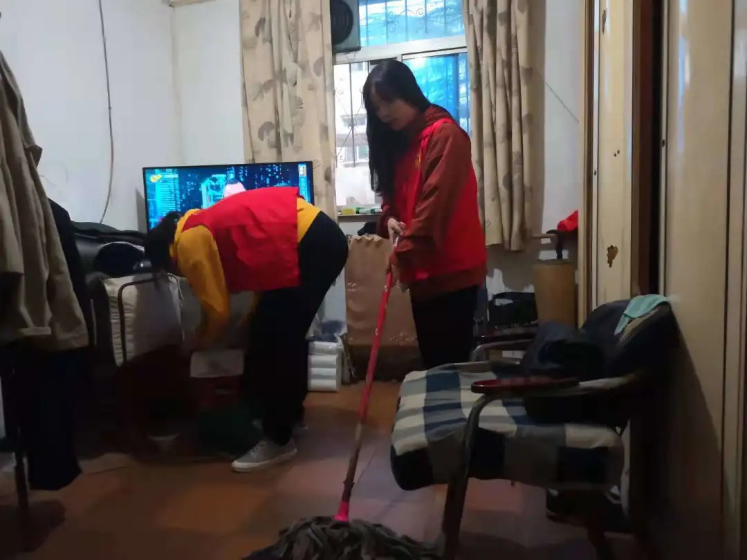 走进家门,叔叔阿姨们很热情的迎接了志愿者和社区人员,志愿者小组开始在家中忙碌起来。帮老人洗刷碗筷,清洁室内,井然有序也气氛高涨。老人说,志愿队的这些年轻人们给他们带来了久违的欢乐和温暖。