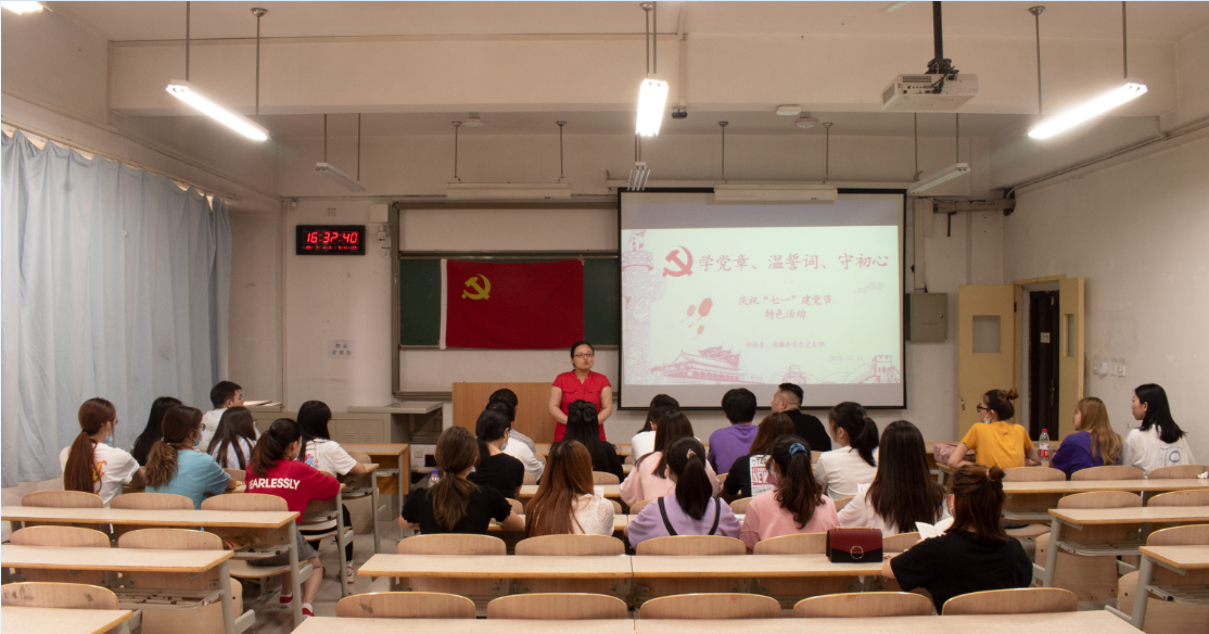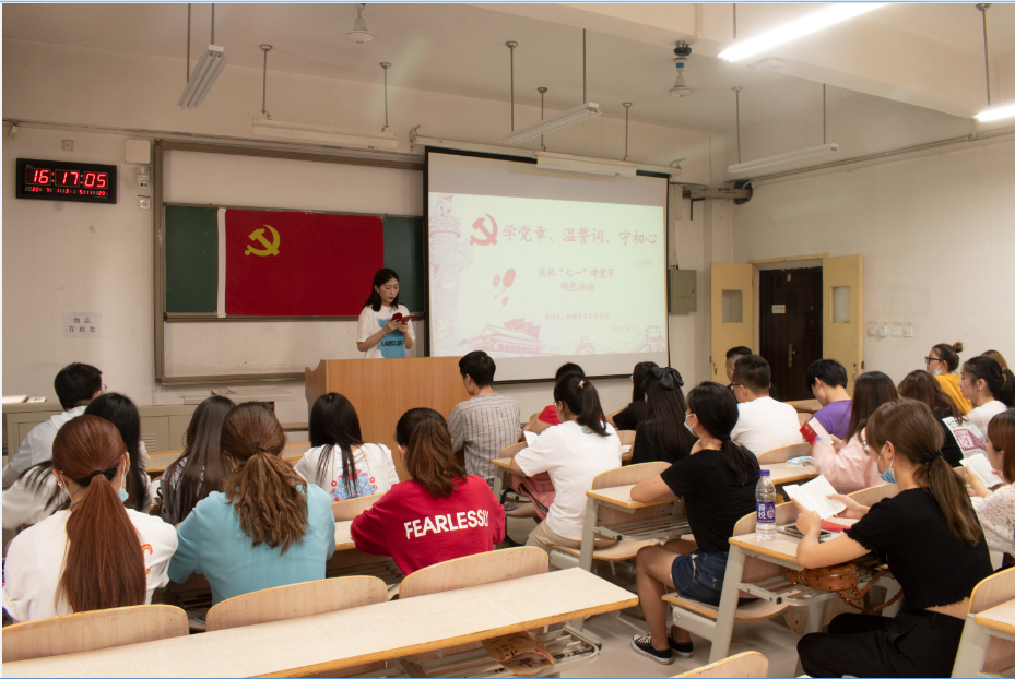 为了庆祝中国共产党建党99周年,KY开元集团官网外语系、传播系学生党支部于7月1日下午16点在教学楼D107开展了主题为“学党章、温誓词、守初心”的“七·一”建党节特色活动。本次活动由党支部书记张天主持,组织委员杨耀聪、宣传委员刘牧原以及党支部全体党员共同参与。