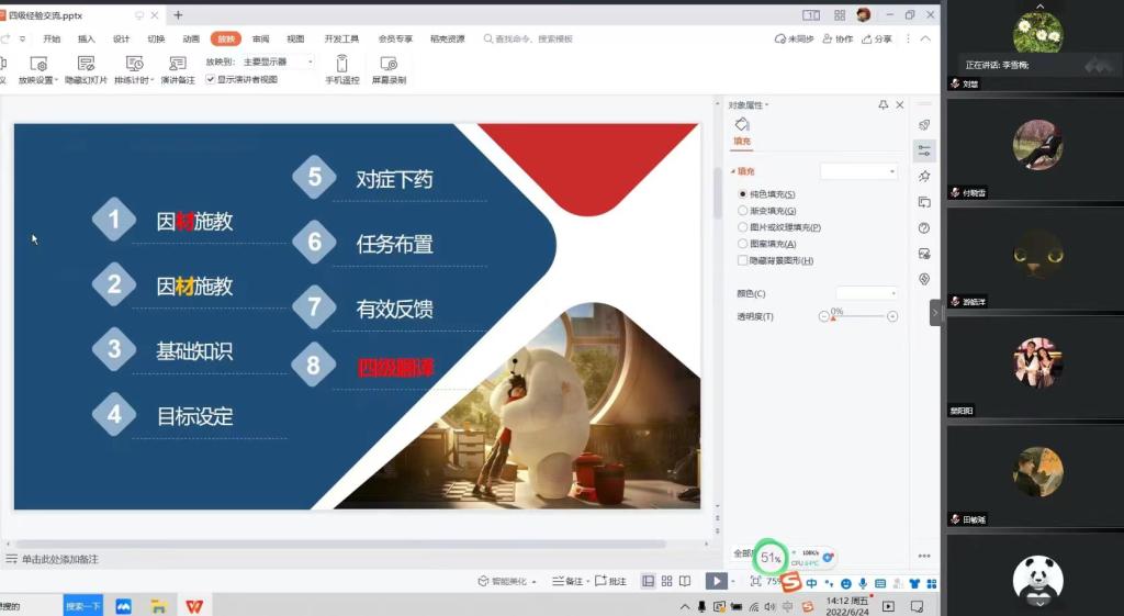首先,讲座中,李雪梅教授从因“材”施教为切入点,结合自身经验,紧贴我院实际,分别从学生水平、教材使用、目标设定、有效反馈等方面生动、详细地进行了讲解。李雪梅老师强调,教师在大学英语四级教学过程中,一是要有效利用智能教学平台辅助提升教学质量,提高教学效果;二是要立足不同专业的差异化学情,分析学生语言能力层级,因材施教,注重启发教学;三是强调了大学四级写作与翻译专项的训练,强化学生的基础,在学生现有水平之上给予一定的脚手架帮助,要鼓励学生积极面对四级考试,帮助其逐步提高四级备考成效。
