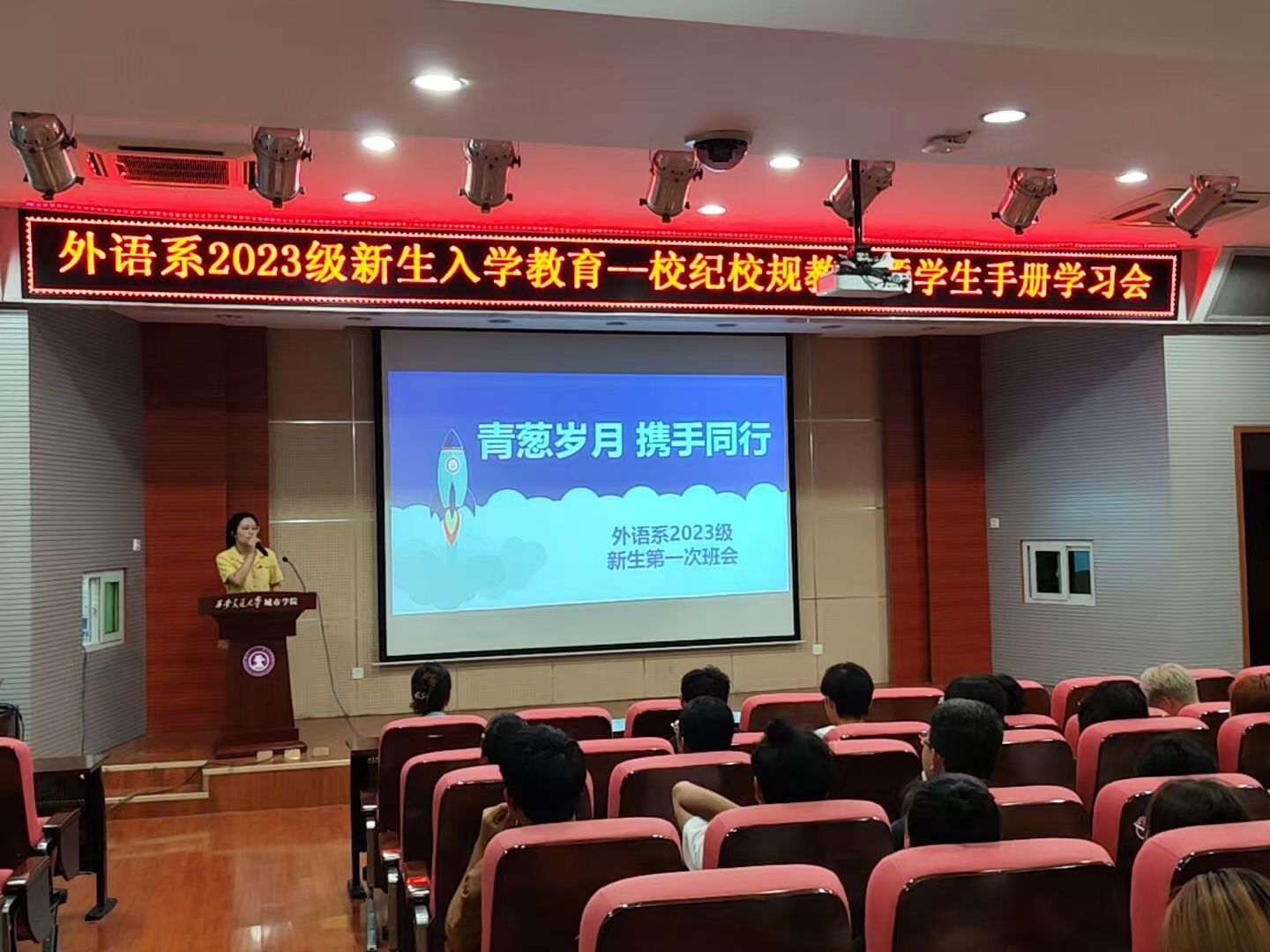 9月6日下午,外语系在F100召开校纪校规教育暨学生手册学习会。新生辅导员韩蓉从常见的学生疑问着手,就学生违纪处理办法、请假考勤制度、课内外学分认定要求等进行详细地解答,帮助新生更好地适应大学生活。韩老师希望刚刚入学的莘莘学子充分认识到拥有自己独特的一面是一件值得骄傲的事,学会悦纳自我;大学与高中不同,评价的尺子不再只有一把,要勇敢诚信,学会独立勇敢;学习过程中要学会“自讨苦吃”;更要自己、爱他人,也要能感受到被爱,具有爱与被爱的能力。