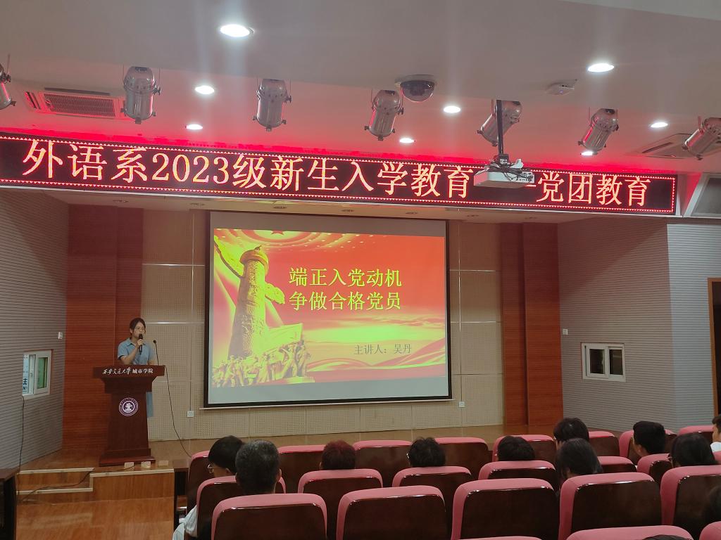 9月7日下午,外语系在F100开展入党启蒙教育、团学教育。外语系学生党支部书记吴丹就端正入党动机、入党具体流程、如何成为一名合格的共产党员等方面进行讲述,希望同学们提高政治觉悟,提高积极向党组织靠拢。外语系团工委书记韩蓉对外语系团学活动进行展示,鼓励学生积极参加社团活动,勇于展现自我,提升综合能力,同时对智慧团建和青年大学习提出要求。同时邀请国际交流项目办霍煜瑞老师详细介绍了学院现有的“2+2”留学项目的基本情况、培养目标、就业前景和升学优势,鼓励学生结合专业特点,做好学业生涯规划,利用出国留学的机会开阔眼界、增长见识、提升学历。