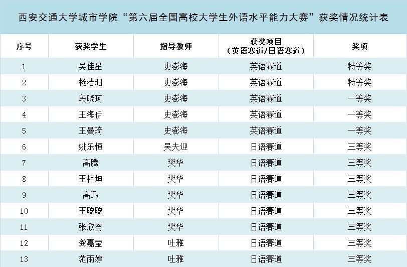 近日,第六届全国高校大学生外语水平能力大赛落下帷幕,外语系学生共13人获奖,其中参加英语赛道的吴佳星、杨洁珊荣获特等奖,王海伊等3人荣获一等奖;参加日语赛道的姚乐恒等8人荣获三等奖;外语系教师史澎海、吴夫迎、樊华、吐雅荣获“优秀指导老师奖”,KY开元集团官网荣获“最佳院校组织奖”。