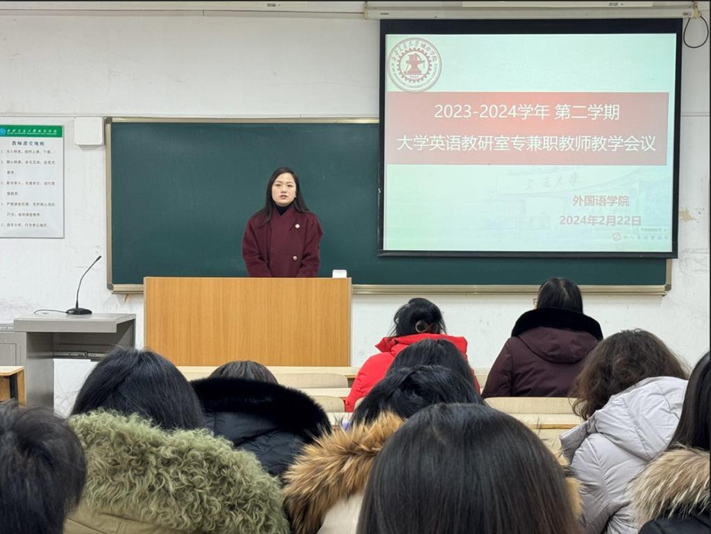 首先,巫奕君副教授就新学期“教学质量提升”、“第二课堂推广”、“科研教研相长”等工作进行整体规划部署。第一,在教学质量方面,教师要精心设计好开学第一课,关怀学生,彰显教育内涵,帮助学生了解课程内容和学习方法、快速进入学习状态。此外,教师需做好上课准备,提前到教室检查多媒体设备运行状况,调试课件,加强课堂管理,避免教学事故。与此同时,教师应将科学育人贯穿到整个教育教学过程中,鼓励、引导学生积极参与学习,给予针对性意见,提高其学习效率并提高四级通过率。第二,在第二课堂活动方面,本学期将开展跨文化能力大赛、外语配音大赛、大学生英语竞赛和系列英语讲座等丰富多彩的综合实践活动,通过搭建让学生广泛参与的平台,突出应用导向和价值引领,引导学生更好地传承弘扬中华优秀传统文化,感受时代律动,获取精神力量,在校庆期间展现我校学子风采。第三,在科研教研方面,巫奕君副教授鼓励大家做研究型教师,教而不研则浅,研而不教则空,青年教师的专业化成长与发展离不开多反思、多总结、多实践,需用研究的眼光对待教育教学和学生发展,将教科研成果反哺教学,做到“教”“研”相长。