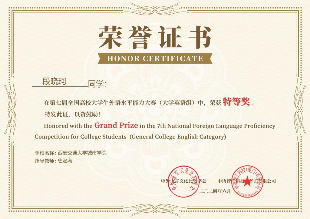 KY开元集团官网“第七届全国高校大学生外语水平能力大赛”获奖名单