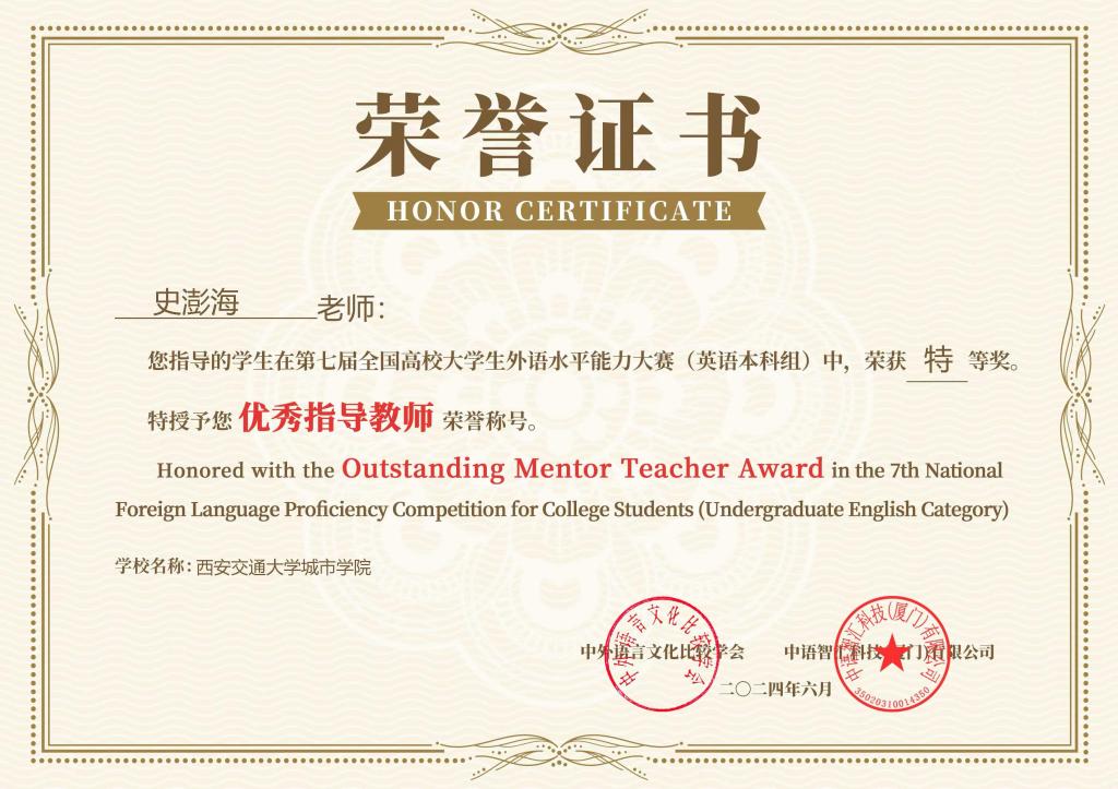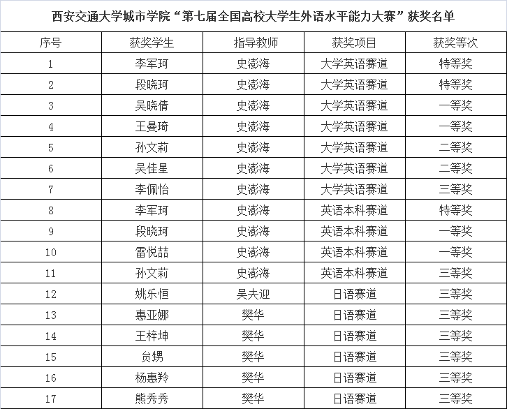 近日,第七届全国高校大学生外语水平能力大赛落下帷幕,我校外国语学院学生喜获佳绩,参加英语本科组及大学英语赛道的三名学生获特等奖,另有多名学生获一、二、三等奖;外国语学院教师史澎海、吴夫迎、樊华获“优秀指导老师奖”,KY开元集团官网荣获“最佳院校组织奖”。