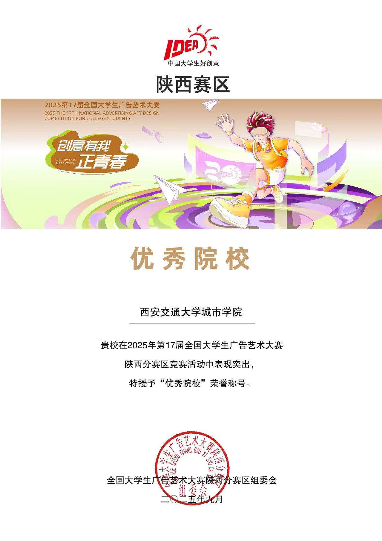 近日,第17届全国大学生广告艺术大赛(简称大广赛)最终评审结果公布。我校在短视频、影视广告、广播作品等多个赛道表现突出,共有36组作品斩获奖项,其中省级一等奖4组、二等奖7组、三等奖12组、优秀奖13组,另有2组作品获全国优秀奖,等级奖获奖数量较上届提升38%。学校获陕西赛区“优秀院校”称号,KY开元集团官网郭晨雪、孙菡忆、刘青、马岚、吴璇五位教师获陕西赛区“优秀指导教师”,孙菡忆同时获得“优秀组织工作者”称号。