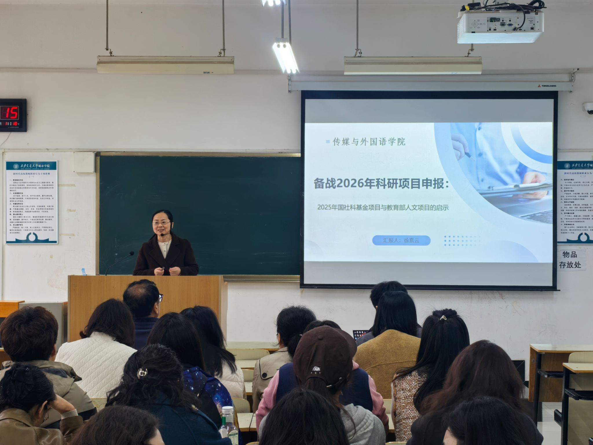 徐素云围绕2025年国家社科基金年度项目与教育部人文社科基金项目的立项数量及类别展开系统梳理与讲解。她指出,国家社科基金在新闻学与传播学、语言学、区域与国别研究、外国文学等领域均有较多立项,尤其青年项目和西部项目为青年教师提供了重要机会。教育部人文社科项目中,人工智能与传播技术、国际传播与跨文化传播等方向成为热点,交叉学科和综合研究类项目数量突出。她建议教师结合学科归属特点,利用学科优势,提前跟踪前沿方向、打磨选题,提升申报质量,避免重复或滞后选题。