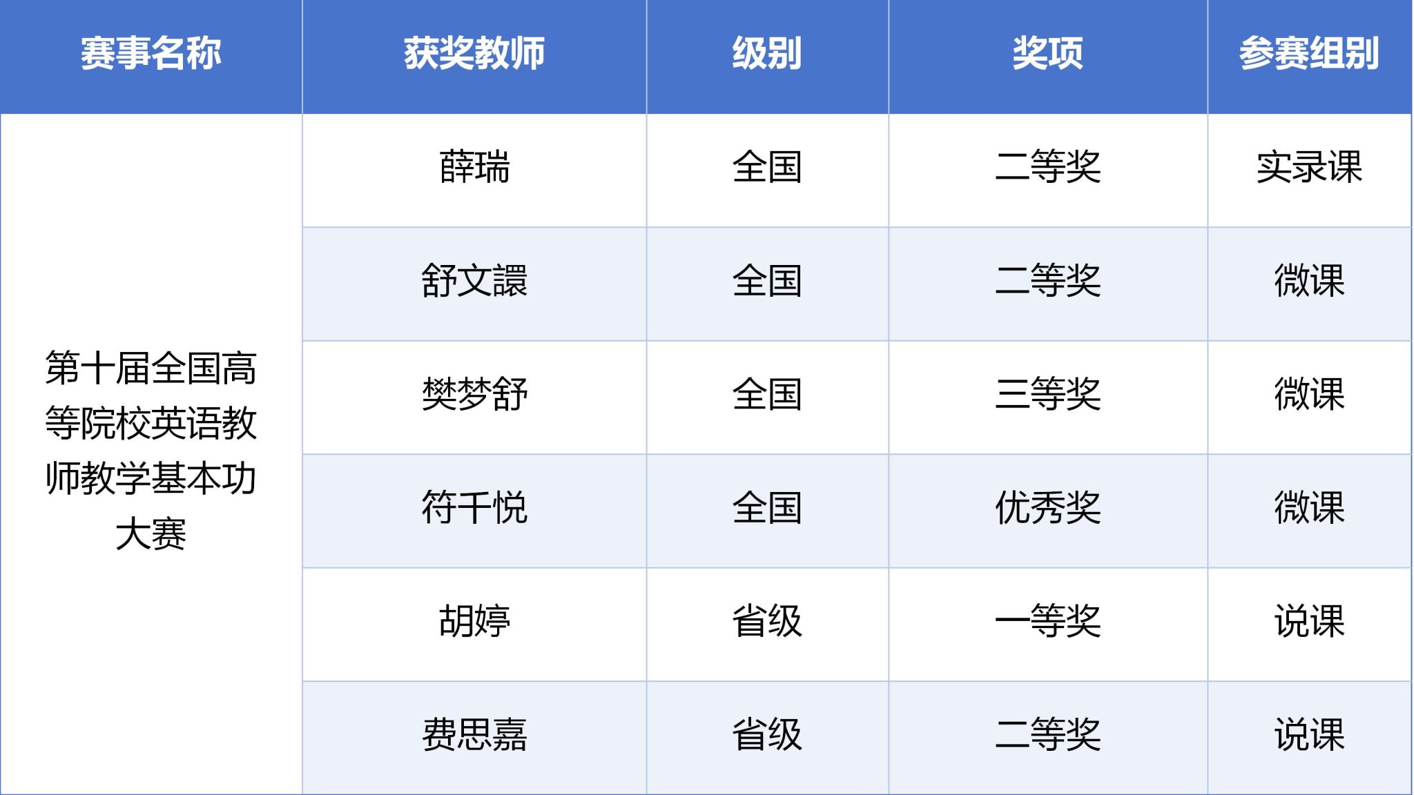 近日,由教育部高等学校大学外语教学指导委员会主办的第十届全国高等院校英语教师基本功大赛决赛于南京落下帷幕,我校KY开元集团官网教师薛瑞获优秀课例评比实录课组全国二等奖,多位教师获得不同赛道多个奖项。此项比赛是我国高校英语教师教学技能领域最具影响力的全国性赛事之一,比赛充分展现了我校英语教学团队的过硬实力。