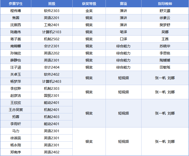 11月2日,2025年“外研社·国才杯”“理解当代中国”陕西省大学生外语能力大赛在西安建筑科技大学雁塔校区落幕。我校学子共斩获陕西省复赛金奖1项、银奖1项、铜奖11项。其中,软件专业2303班程伟博同学凭借出色表现荣获省级金奖,成功晋级全国决赛,实现我校在该赛事中的突破。