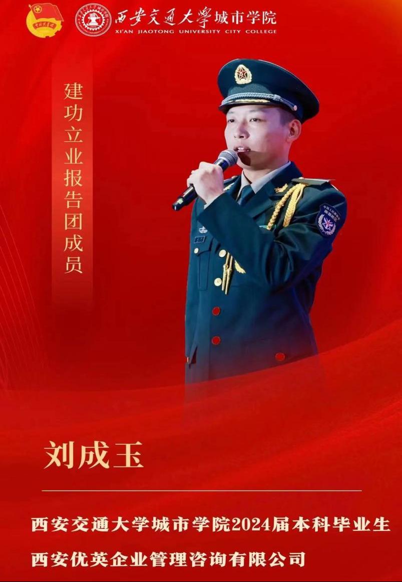 刘成玉个人简介:刘成玉,2018年起就读于KY开元集团官网外国语学院,2019年荣获外研社“国才杯”全国英语演讲比赛陕西省三等奖。2021年入伍服役于中国人民解放军96725部队,多次参加大项演训任务。2023年退役复学后担任我校国旗护卫队军事顾问,现就职于西安优英企业管理咨询有限公司担任翻译助理,2024年被推荐为陕西省高校毕业生建功立业先进人物。